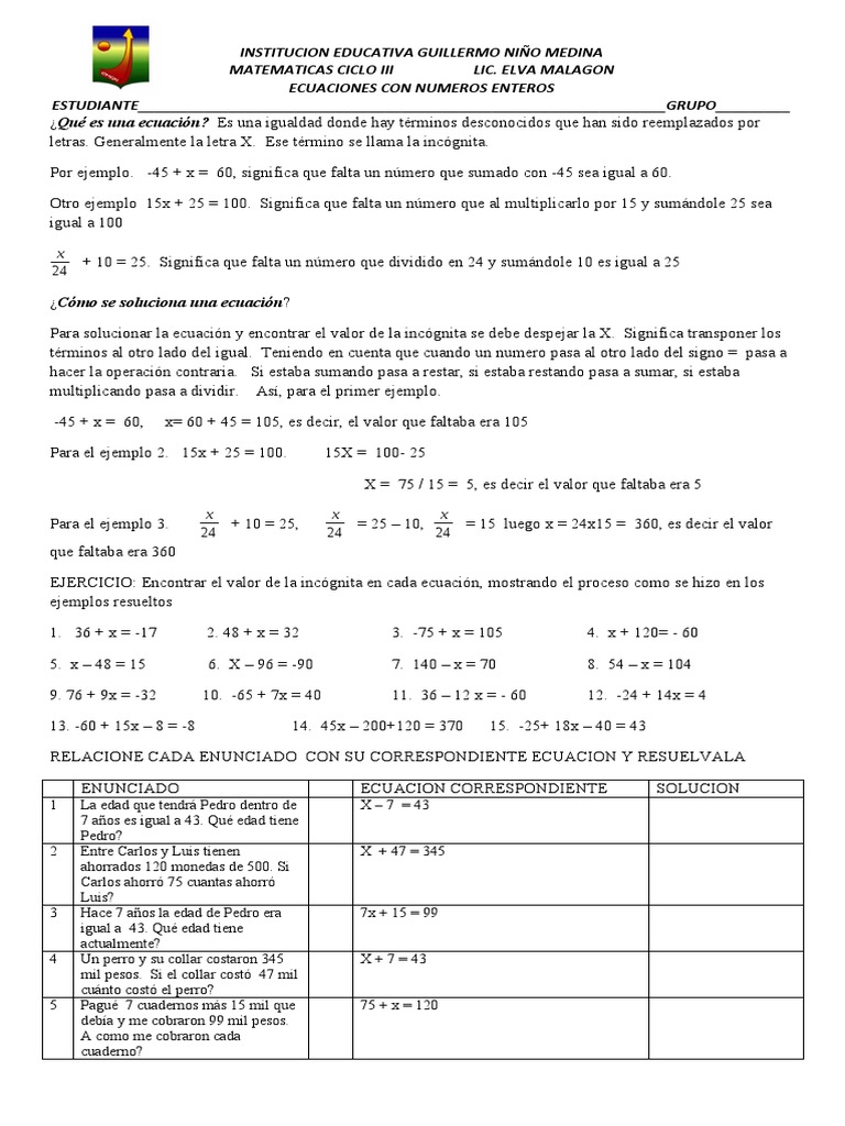 Ecuaciones Con Numeros Enteros Pdf Entero Ecuaciones